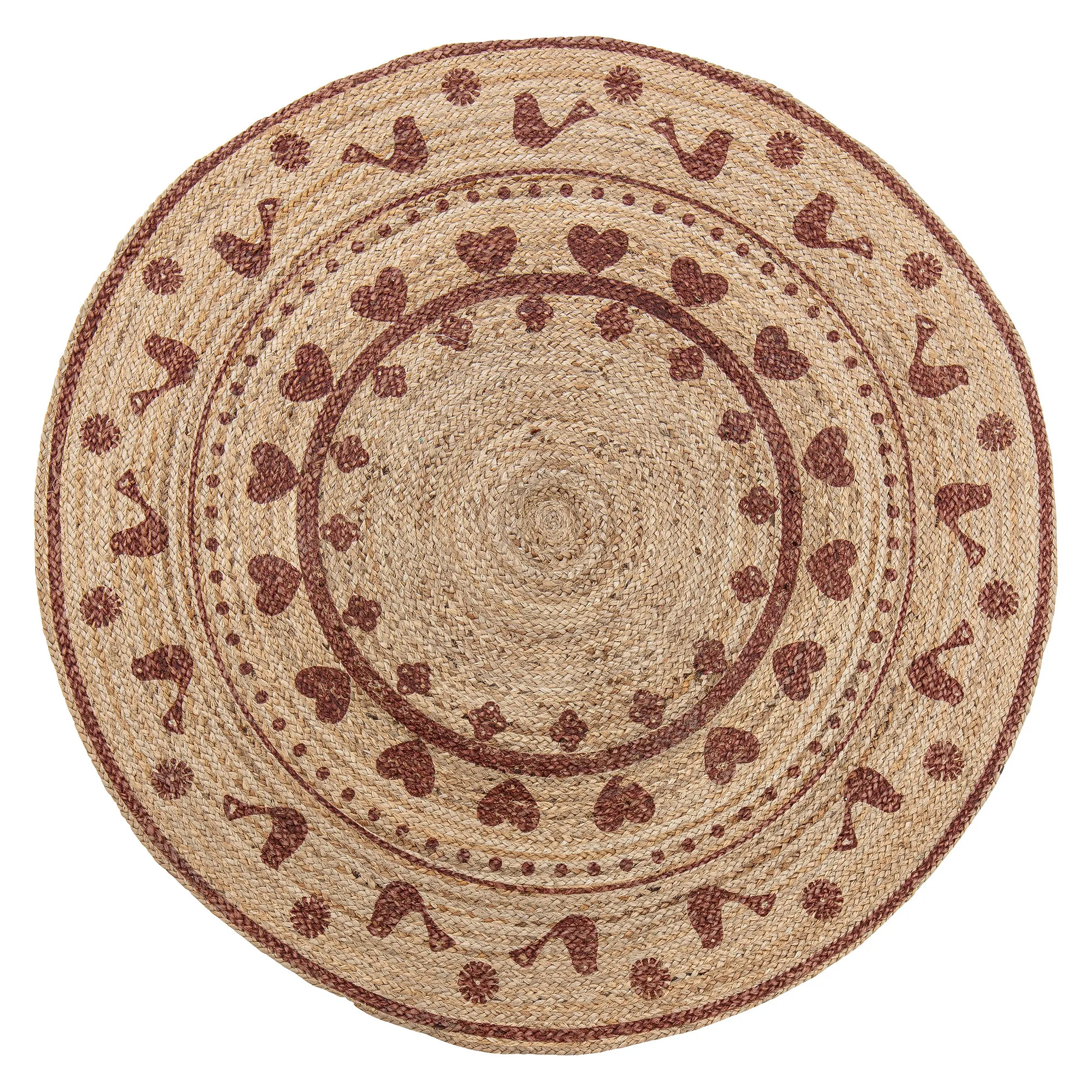 Der Alav Weihnachtsbaumteppich Ø120cm von Bloomingville ist aus Jute gefertigt und ein schöner runder Teppich mit einem dekorativen Muster, das unter anderem kleine Herzen, Punkte und Vögel zeigt. Legen Sie den Teppich unter den Weihnachtsbaum für eine dekorative Atmosphäre und schützen Sie gleichzeitig den Boden. Der Weihnachtsbaumteppich ist ein stilvolles Wohnaccessoire das Sie jedes Jahr wieder hervorholen und benutzen können, wenn es Zeit wird den Weihnachtsbaum zu schmücken.